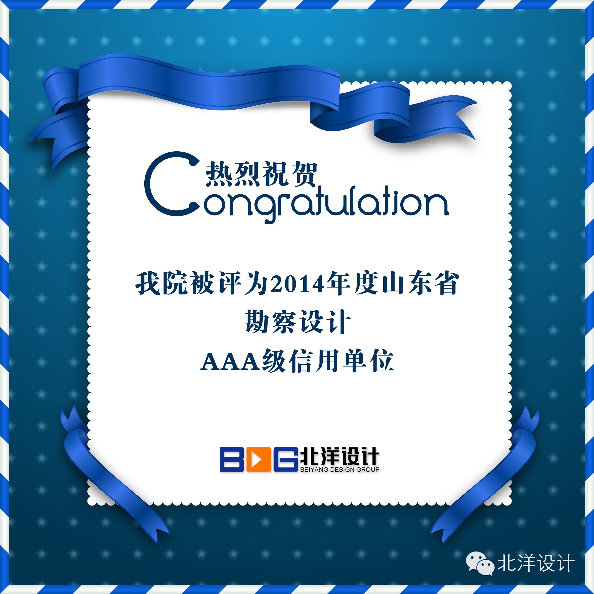 【北洋·喜報】祝賀我院被評為2014年度山東省勘察設(shè)計AAA級信用單位
